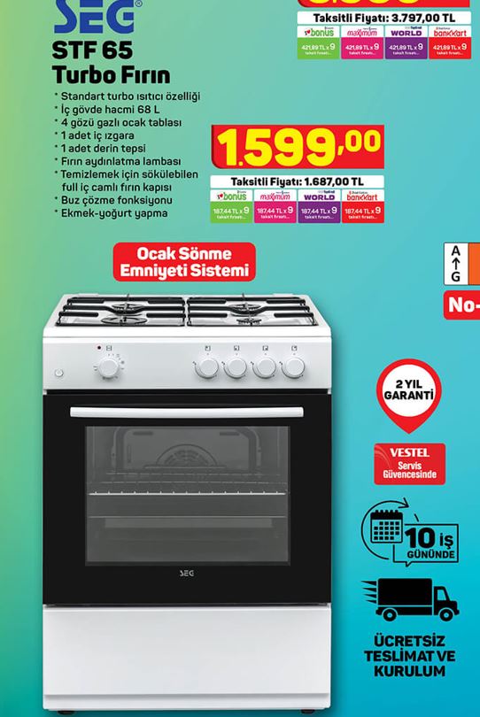 SEG STF 65 Turbo Fırın- Standart turbo ısıtıcı- İç gövde hacmi 68 L- 4 Gözlü ocak tablası- 1 adet iç ızgara- 1 adet derin tepsi- Fırın aydınlatması- Sökülebilen iç camlı fırın kapısı- Buz çözme özelliği- Ekmek-yoğurt yapma özelliği
