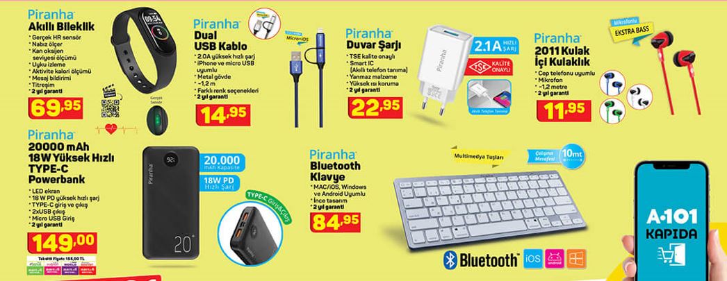 - Piranha Akıllı Bileklik: 69, 95 TL- Piranha 20000 mAh 18W yüksek hızlı Typce-C Powerbank: 149 TL- Piranha Bluetooth klavye: 84, 95 TL- Piranha dual USB kablo: 14, 95 TL- Piranha Duvar şarjı: 22, 95 TL- Piranha kulak için kulaklık: 11, 95 TL