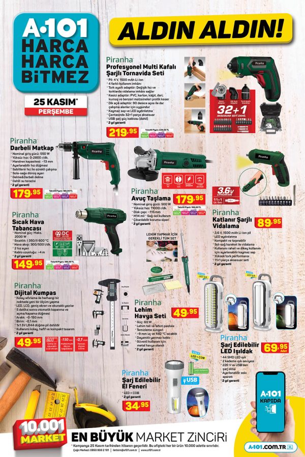 - Piranha Profesyonel Multi Kafalı Şarjlı Tornavida Seti: 219, 95 TL- Piranha Darbeli Matkap: 179, 95 TL- Piranha Avuç Taşlama: 179, 95 TL- Piranha Katlanır Şarjlı Vidalama: 89, 95 TL- Piranha Sıcak Hava Tabancası: 149, 95 TL- Piranha Dijital Kumpas: 49, 95 TL- Piranha Lehim havya Seti: 49, 95 TL- Piranha şarj edilebilir LED ışıldak: 69, 95 TL- Piranha şarj edilebilir el feneri: 34, 95 TL