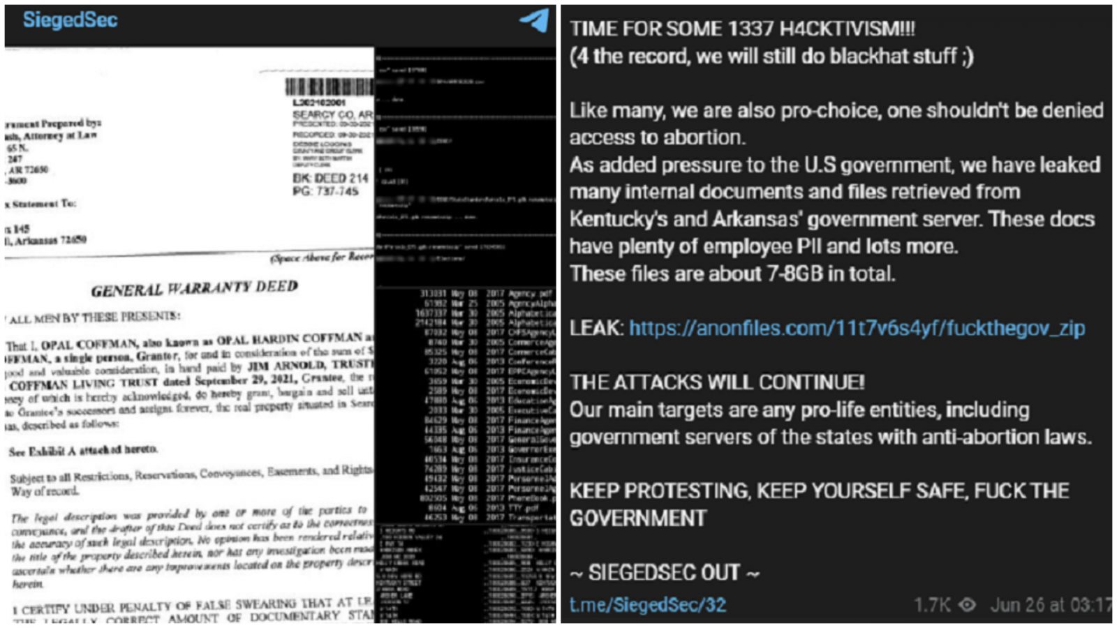 Duyuruya ek olarak grup, Arkansas ve Kentucky'deki hükümet sunucularını zaten hacklediğini ve hükümet çalışanlarının kişisel bilgilerini içeren yaklaşık 8 gigabayt veriyi çaldıklarını iddia ettiTelegram'a konuşan SiegedSec, saldırıların devam edeceğini ve hedeflerinin, kürtaj karşıtı yasalara sahip eyaletlerdeki tüm hükümet sunucularını hackleme olduğunu bildirdi.