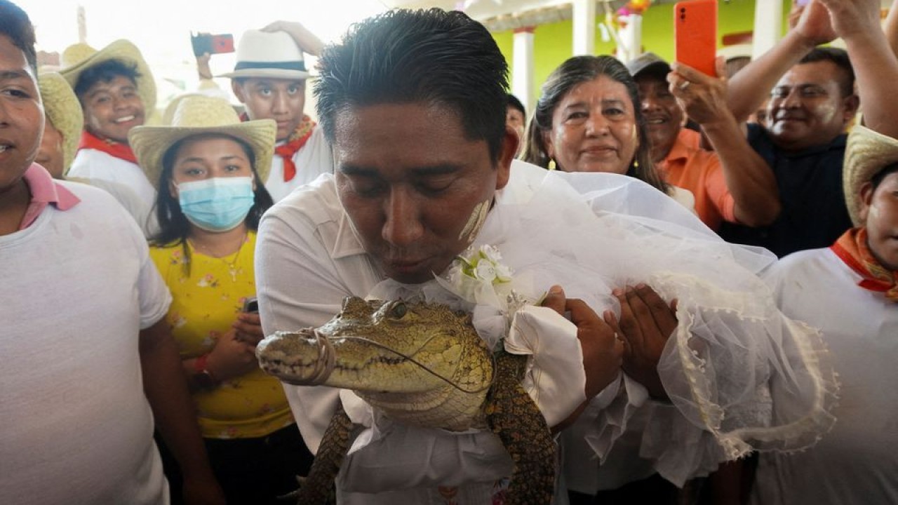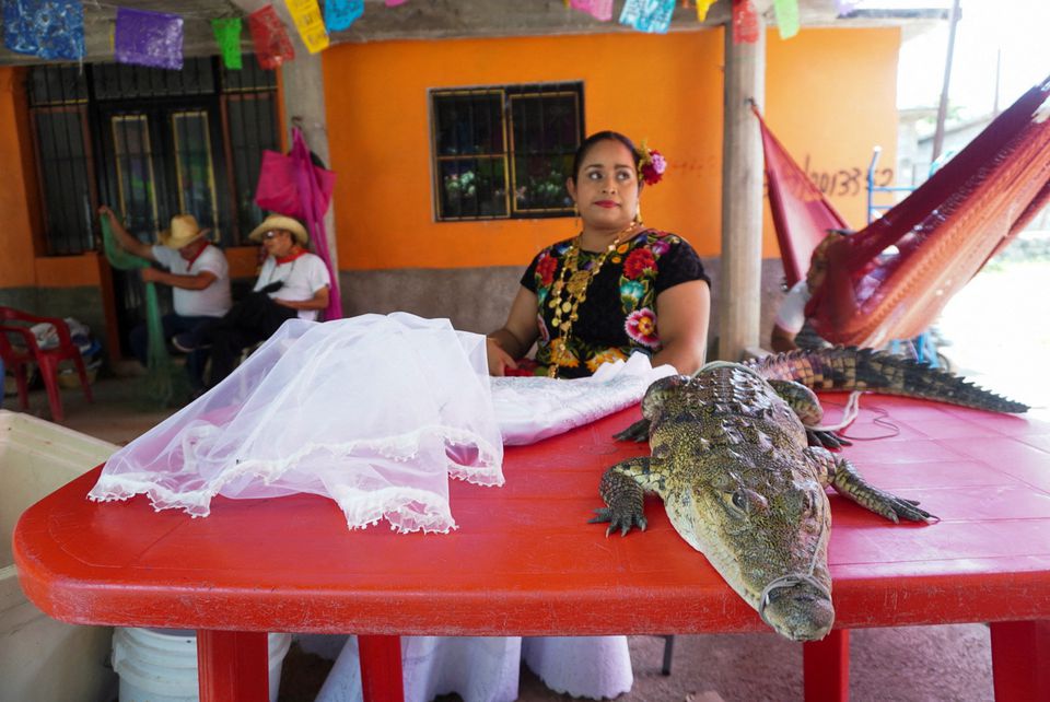 San Pedro Huamelula'daki, Katolik maneviyatıyla karıştırılmış asırlık ritüel, timsahı beyaz bir gelinlik ve diğer renkli giysilerle giydirilmeyi de içeriyor.
