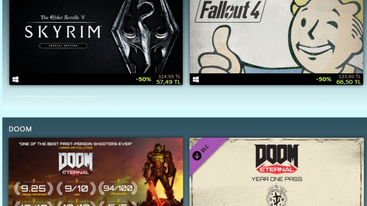 Bethesda oyunları şu anda bildiğiniz gibi Xbox Game Pass kütüphanesinde de erişilebilir durumda. Oyunları satın almadan önce bu alternatifi de düşünebilirsiniz.Bethesda Bayram İndirimleri sayfasına ulaşmak için tıklayın.İşte kampanyada öne çıkan bazı indirimler:Prey: 57, 49 TLDoom Eternal: 65, 67 TLDoom: 49, 50 TLWolfenstein The New Colossus: 53, 60 TLDishonored 2: 57, 49 TLFallout 4: 66, 50 TLFallout 3 GOTY Edition: 15, 50 TLFallout New Vegas: 9, 00 TLThe Elder Scrols V: Skyrim - Special Edition: 57, 49 TLRage 2: 74, 75 TLRage: 14, 49 TL