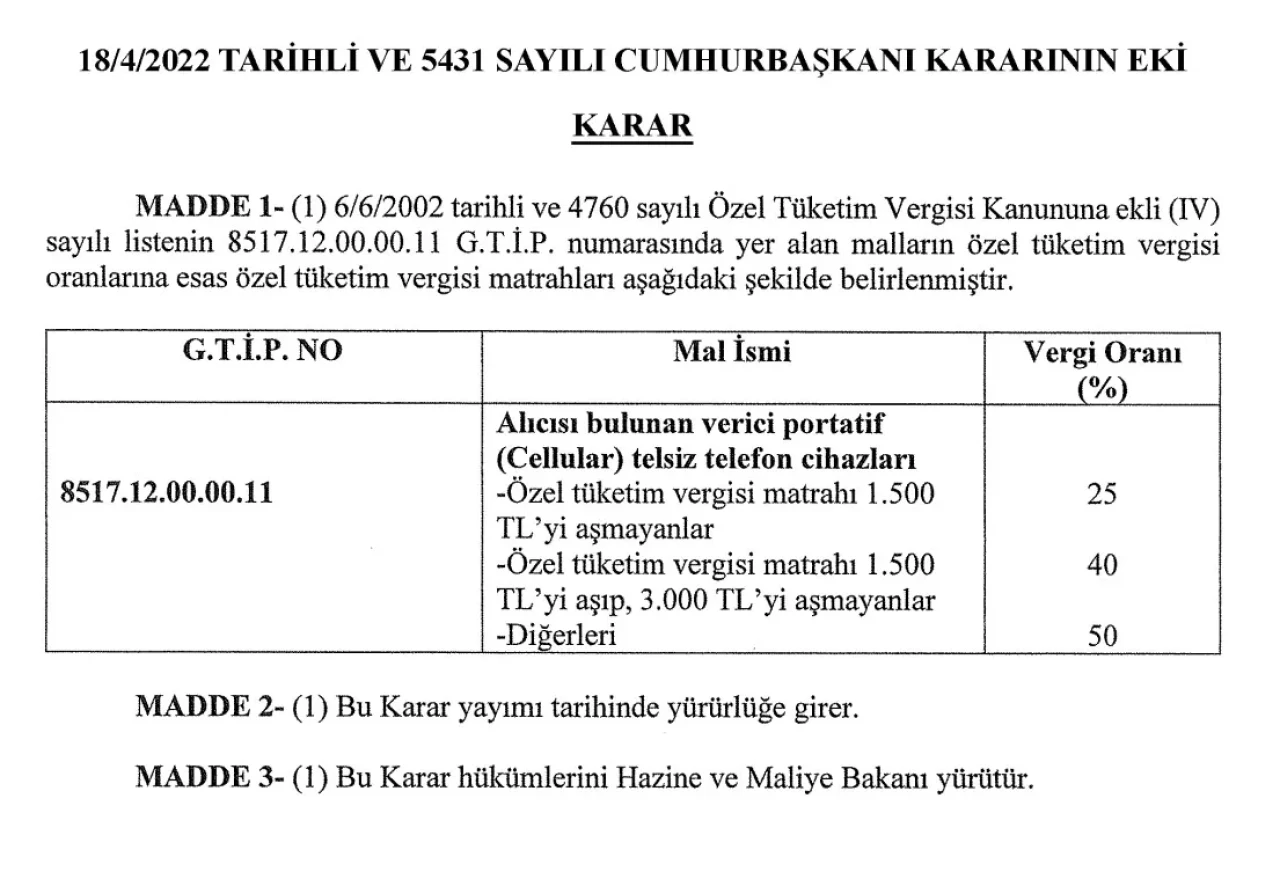 Resmi Gazete’de yayınlanan karar ile cep telefonlarında uygulanan ÖTV matrahı yeniden düzenlendi. Cep telefonlarında uygulanan %25, %40 ve %50 olmak üzere 3 farklı ÖTV bulunuyor. Bunların %25’lik olan en alt dilime tabi olan cep telefonlarında ÖTV matrahı artırıldı. Böylece giriş seviyesi cihazların daha uygun fiyata satılmasının önü açıldı.