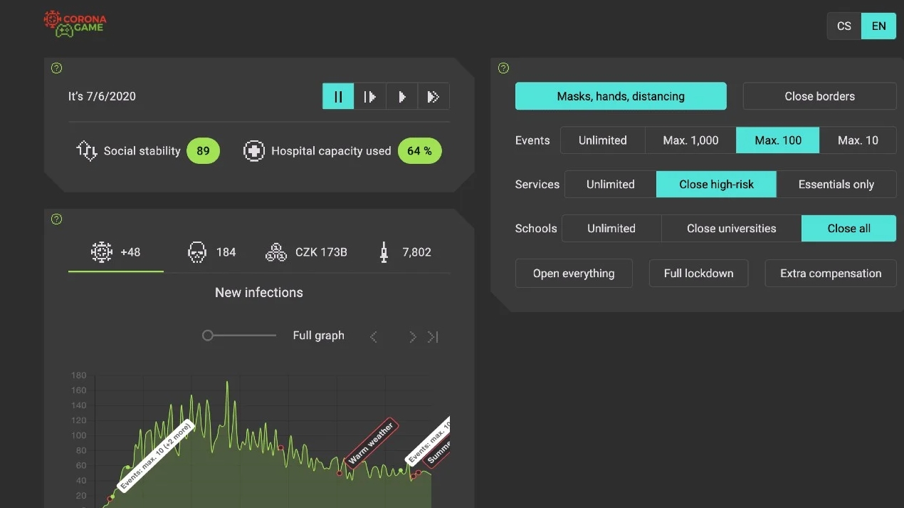 CoronaGame'i oynamak için buraya tıklayabilirsiniz ve koronavirüs mücadelenize başlayabilirsiniz. Oyunda dikkat etmeniz gereken en önemli şey, 1 buçuk yıl içerisinde verdiğiniz kararların insanların psikolojini nasıl etkileyeceği ve hastane doluluk oranını nasıl yöneteceğiniz olacaktır. Oyunda okulların kapanıp kapanmayacağına ya da etkinlik kapasitelerine kadar birçok kriteri değiştirebiliyorsunuz.