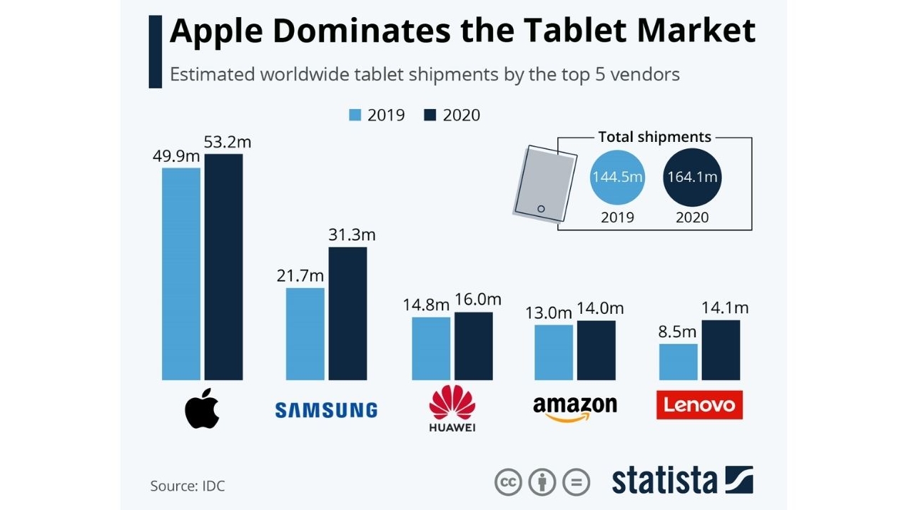 Apple düzenlediği etkinliğinde sıcağı sıcağına yeni M1 işlemcili iPad Pro'sunu tanıtmışken, Statista tarafından dünyanın en çok satan tablet markaları üzerine bir araştırma yayınlandı.Yeni tanıttığı iPad Pro'su ile dünyanın en güçlü tabletine sahip olan Apple, aynı zamanda 2019 ve 2020 yıllarında satışlarda da dünya lideri olmayı başardı. 2019 yılında toplamda 144.5 milyon tablet satışı gerçekleşmişken 2020 yılına gelindiğinde bu satışlar oldukça yükselmiş ve 164.1 milyon adet olmuş. Bunlara ek olarak Apple 2019 yılında yaklaşık 50 milyon iPad satmışken, 2020 yılına gelindiğinde ise bu rakam 53.2 milyon adete kadar yükselmiş. 2020’de yeni iPad ve iPad Air’in piyasaya sürülmesi, 19 milyon tabletin sevkiyatına neden oldu ve bu teknoloji devinin yüzde 36, 5 oranında tablet pazarına hakim olmasına neden oluyor.