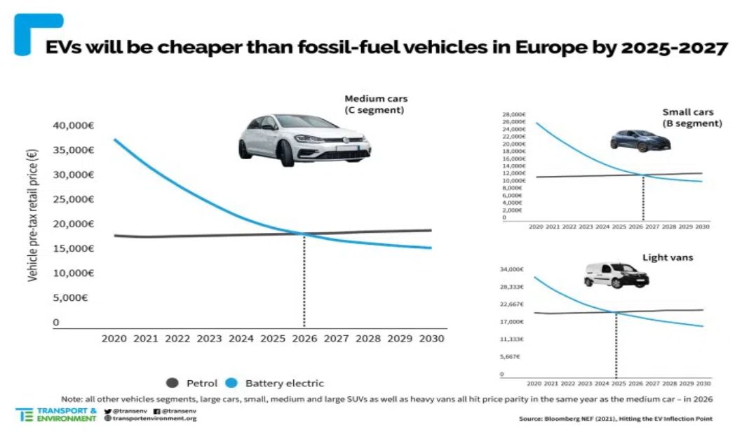 Görselde gördüğünüz gibi önümüzdeki yıllarda fiyatlarda yaşanması beklenen değişimi segmentlere göre daha net görmek mümkün.Örneğin C segment benzinli otomobilin vergi hariç ortalama satış fiyatı 19 bin Euro civarındayken tamamen elektrikli olması bu değeri 35 bin Euro’ya kadar yükseltiyor ancak 2026 yılına gelindiğinde 20 bin Euro civarında eşitliğin sağlanabileceği düşünülüyor.2020 yılında Çin elektrikli araç pazarı haline gelse de 2021 yılında Avrupa bunu geride bıraktı. Sizce elektrikli araçların geleceği nasıl olacak? Düşüncelerinizi Megabayt ekibiyle paylaşmayı unutmayın.