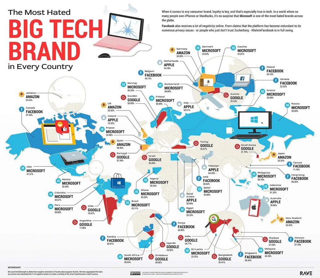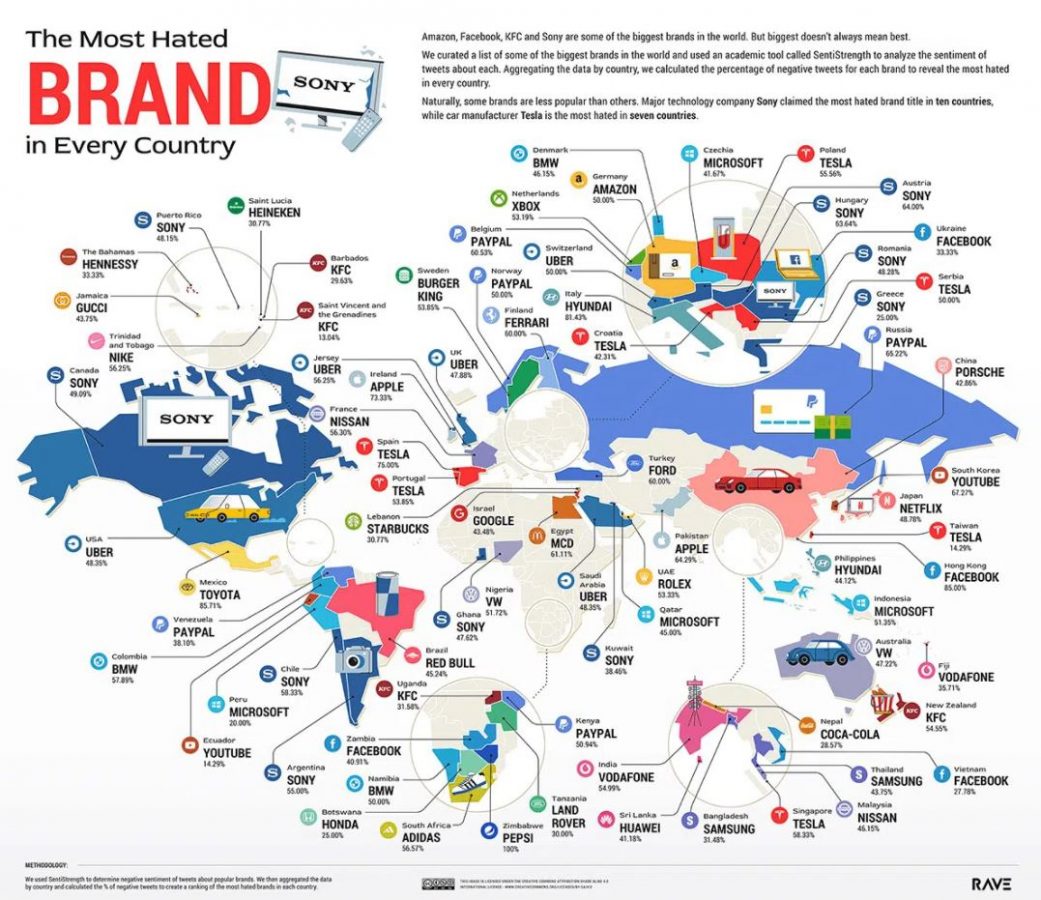 Yayınlanan infografiklerde en nefret edilenler sırasında Microsoft şaşırtıcı bir şekilde zirvede. Öyle ki; Facebook gibi bir markayı bile geride bırakmış durumda. Microsoft tam 22 ülkede en nefret edilen marka oldu. Türkiye'de en nefret edilen markanın Ford olduğu gözüküyor.Listenin ikinci ve üçüncü sırası da oldukça beklenmedik. Japon teknoloji devi Sony ikinci sırada yer alırken, elektrikli otomotiv dünyasının inovatif markası Tesla üçüncü sırada. Çalışma, fast food, video oyunları ve sadece büyük şirketler dahil olmak üzere çeşitli kategorilerden yüzlerce tanınmış markayı içeriyordu. En nefret edilen markaların aynı zamanda en popüler markalar olduğu da su götürmez bir gerçek.[caption id="attachment_32477" align="alignnone" width="1045"]