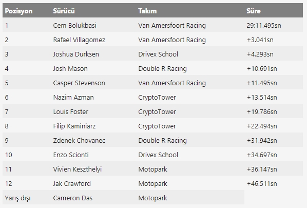 Yarışın 6. turunda Cameron Das blokaj yaptı ve pistten taştı. Lastiğinin aldığı hasar yüzünden de bir sonraki virajda lastik patlattı. Ardından pite kadar ulaşmayı başarsa da yarış dışı kalmaktan kurtulamadı. Liderliği alan Cem Bölükbaşı, yarışın sonuna kadar yerini korumayı başardı.Bu galibiyetle birlikte Van Amersfoot Racing takımı da ilk galibiyetini almış oldu. Bölükbaşı'nın arkasından da takım arkadaşı Villagomez geldi ve takım yarışta duble yapmış oldu. Yarışın ardından bir açıklama yapan Bölükbaşı, "Daha iyi bir başlangıç olamazdı, ilk galibiyetim 5. sıradan başlayarak geldi. Çok iyi bir start alamadım, devirleri istediğim gibi ayarlayamadım ancak iyi bir ilk tur geçirdik, 1 ve 2. virajdaki hataları değerlendirdik. Sonrasında da lider hata yaptı ve biz de yarışı sorunsuz bir şekilde bitirdik. Böyle düşününce bu gerçekten inanılmaz." dedi.Bugün gerçekleştirilecek olan