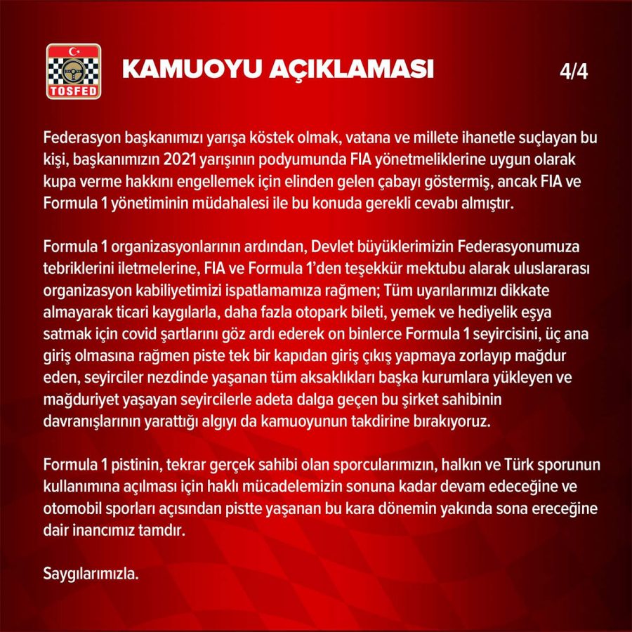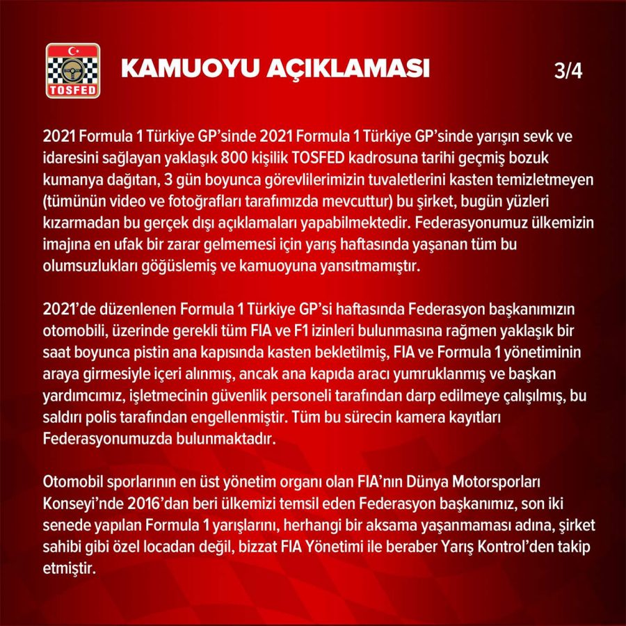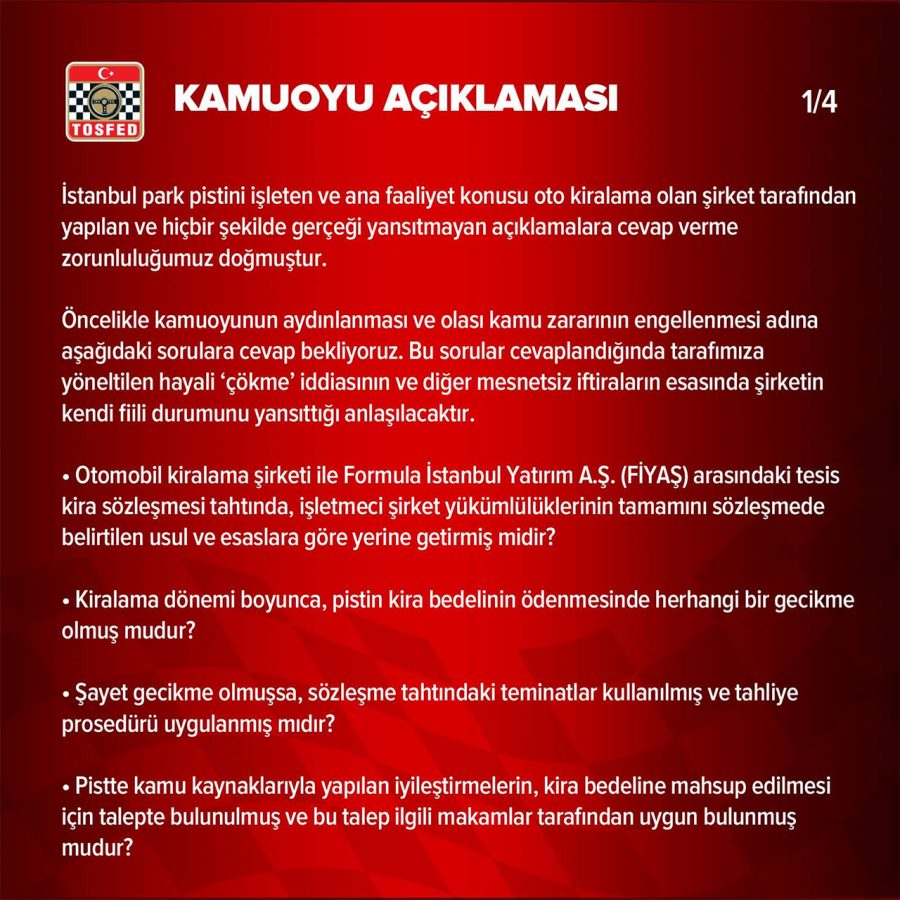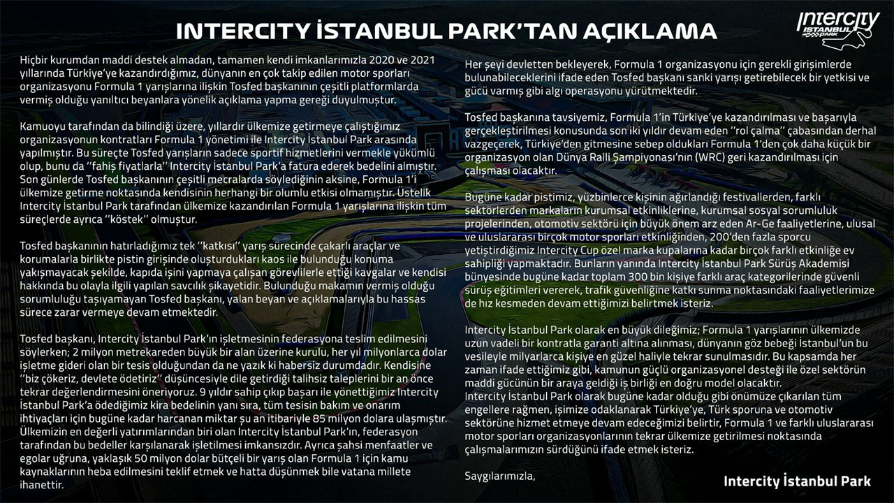 İstanbul Park'ın yönetimini elinde bulunduran Intercity'den TOSFED (Türkiye Otomobil Sporları Federasyonu) hakkında bir açıklama gelmiş ve bu açıklamada Formula 1 yarışlarına ilişkin TOSFED’in yaptığı açıklamaların ‘yanıltıcı’ olduğunu belirtilmişti. Intercity, TOSFED'i algı yapmakla suçlamıştı.