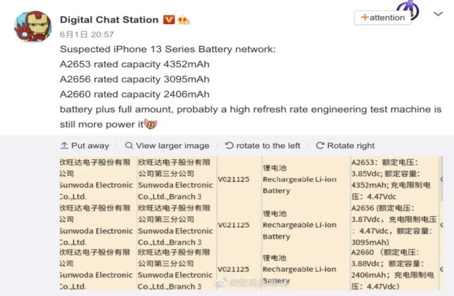 Çinli Digital Chat Station, şirketin yeni nesil akıllı telefonlarının pil kapasitelerini duyurdu. iPhone 13 serisinin şu andaki modellerden daha büyük pilleri olacağı belirtildi.Serinin Pro versiyonlarında ise ekranın