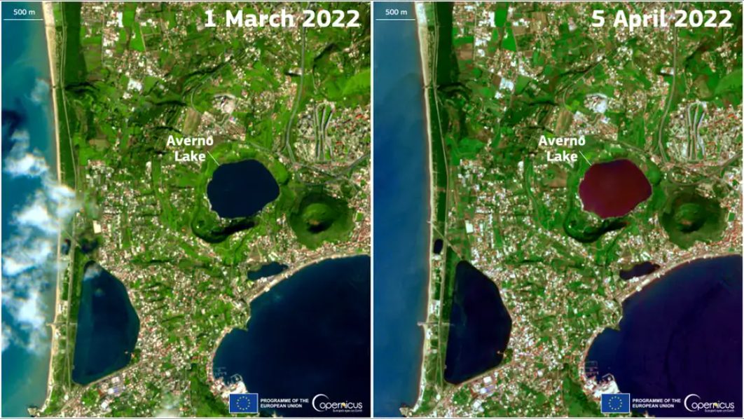 Güney İtalya'daki volkanik bir krater gölü olan Lago d'Averno'nun suları, aşırı alg büyümesi nedeniyle Mart ayının başından bu yana bir anda kan kırmızısına dönüştü.