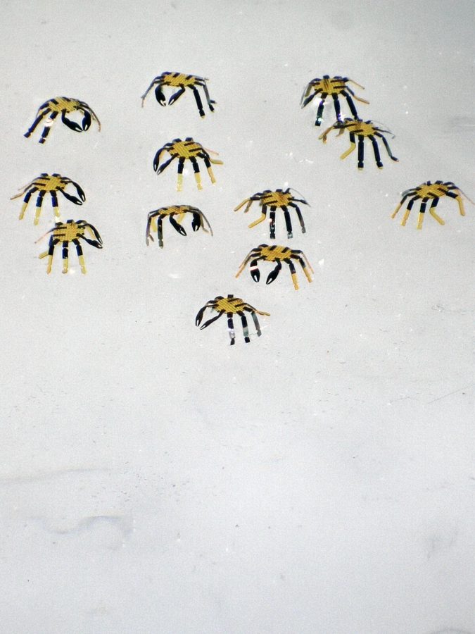 Northwester Üniversitesi'nden mühendisler tarafından yapılan araştırmalar sonucunda, bir pireden bile daha küçük, yengeç şeklinde ve dünyanın şimdiye kadarki en küçük kontrol edilebilir robotu üretildi. Yengeç robot, hidrolik, elektrik veya diğer karmaşık donanımlar tarafından çalıştırılmadan zıplayabilir, bükülebilir, emekleyebilir, yürüyebilir ve dönebilir.Yengeç, vücudunun çeşitli bölgelerine bir lazer ışını uygulanarak, onları ısıtarak ve şekil değiştirmelerini sağlayarak kontrol ediliyor. Yengeç robotun yapımında kullanılan şekil hafızalı alaşım malzeme, soğuduktan sonra orijinal formuna geri dönmesini sağlıyor. Robotun boyutu, çok hızlı soğumasını sağlar ve bir tarama lazeri kullanmak, lazerin taradığı yönde hareket etmesini sağlar.