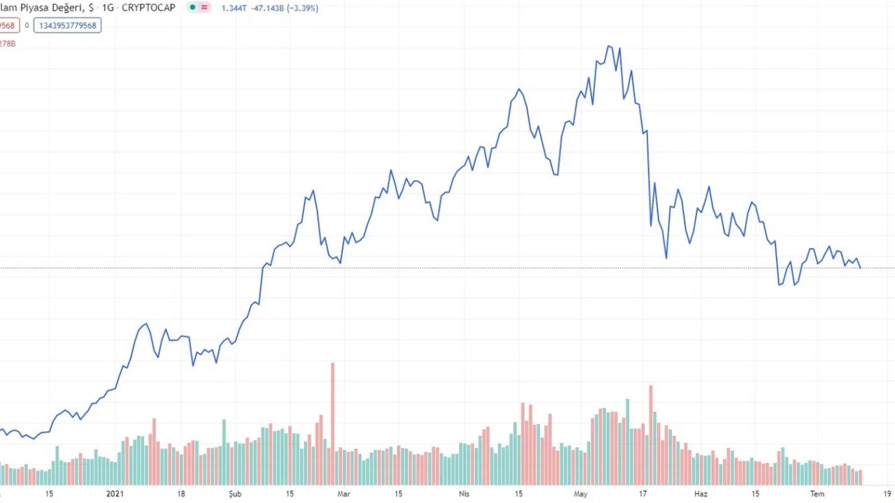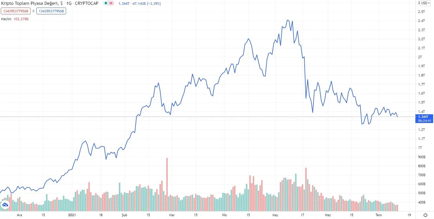 CryptoCompare'in verilerine göre, haziran ayında, kripto borsası spot işlemleri %42.7 düşüş ile 2.7 trilyon dolara, türev hacimleri %40.7 düşüşle 3.2 trilyon dolara geriledi. Bitcon ağır bir düşüş ile geçen ay %6'dan fazla değer kaybetti ve ocak ayından bu yana en dip seviyesini gördü.