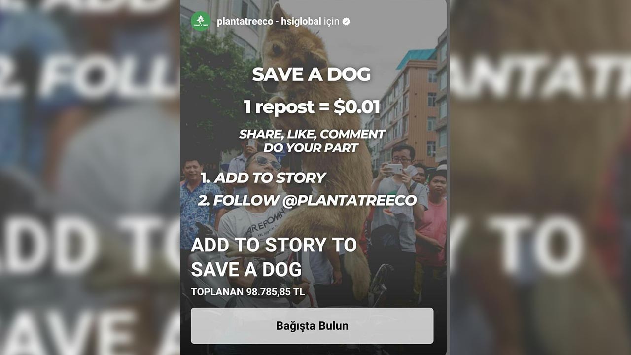 Çin’deki ‘Yulin Köpek Yeme Festivali’ne karşı sosyal medyada birçok hayvansever ‘Save a Dog’ (Köpeği Kurtar) kampanyasını hikayesinde paylaştı. Plant a Tree isimli bir şirket tarafından düzenlendiği iddia edilen kampanya kapsamında yapılan her paylaşımın 0, 01 dolar değerinde olduğu söylendi. Bu kampanyaların siteye trafik çekmek amacıyla yapıldığını söyleyen Plant A Tree adlı girişim, site içerisinde yapılan satışlardan elde edilen gelirin kampanyalara bağışlanacağını belirtti.