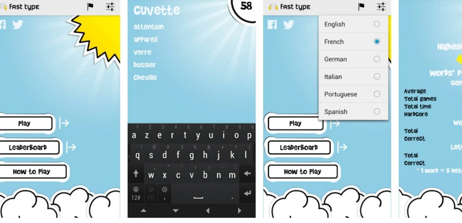 Fast Type - Keyboard Training mobil uygulaması klavye hız testinizi eğlenceli bir ara yüzle keyifli bir oyuna dönüştürür. Uygulama tarafından sunulan testler farklı zorluk seviyelerine sahiptir. Klavye hızını İngilizce, Fransızca, Almanca, İspanyolca, Portekizce ve İtalyanca gibi farklı dillerde test edebilirsiniz. Uygulama ayrıca sonuçlarınızı çeşitli sosyal platformlarda paylaşmanıza ve oradaki arkadaşlarınızı yarışmaya davet etmenize olanak tanır.