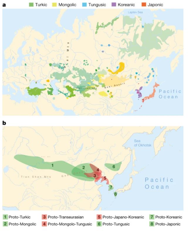yaklaşık 9 bin yıl önce Japonca-Korece-Türkçe’nin içinde bulunduğu dil grubunun, eski Çin'deki darı çiftçileri tarafından kullanıldığı belirtildi.8 bin kilometreden fazla bir alanda kullanılan Trans-Avrasya dillerini konuşan kişilerin genetik ataları belgelendi. Bu araştırmada dilbilimsel, genetik ve arkeolojik kanıtlar birleştirildi.