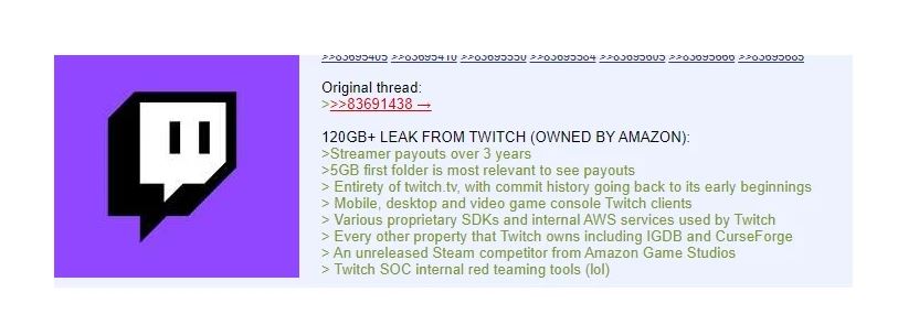 Amazon'un sahibi olduğu dünyanın en büyük canlı yayın platformu olan Twitch dev bir siber saldırıya uğradı ve hacklendi. Twitch'in kaynak kodları, kullanıcı bilgileri, şifreleri ve son 3 yıl boyunca yayıncılara yaptığı ödemelerin ortaya çıktığı iddia edildi Video Game Chronicle ve The Verge'in de doğruladığı habere göre dün akşam saatlerinde 4chan'e bir hacker, 125 GB'lık bir Torrent bağlantısı olarak bu bilgileri yükledi. Twitch'in son 3 yıl boyunca yayıncılara yaptığı bilgiler, mobil, masaüstü ve konsol uygulamalarının kaynak kodları, SDK ve AWS altyapıları ve en önemlisi de Amazon’un henüz yayınlamadığı Steam rakibi platformu hakkında önemli bilgilere ulaşıldı.