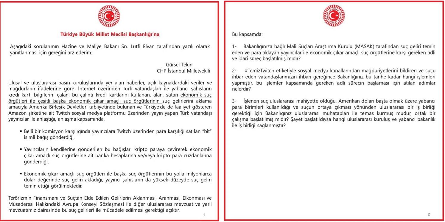 CHP Milletvekili Gürsel Tekin bu iddiaları Meclis gündemine taşıdı. Meclis önergeleri sonrasında konunun nasıl şekilleneceği merak konusu.Olayların ortaya çıkmasında önemli payı olan ünlü yayıncı Jahrein'in anlattıklarına göre Twitch'te yaşanan dolandırıcılık olayı şu şekilde işliyor: