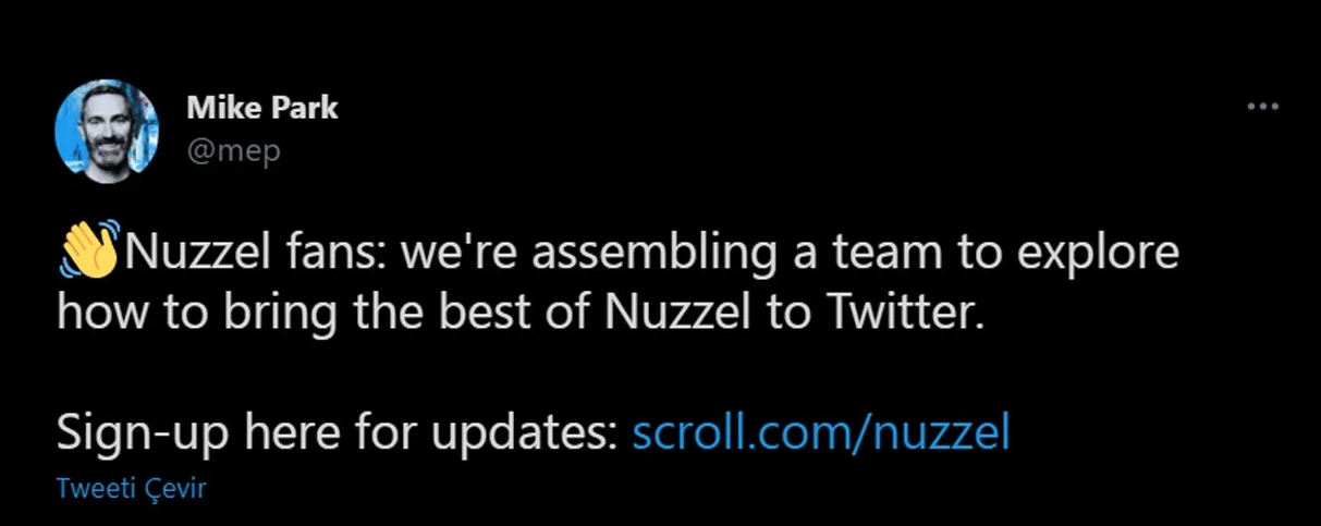 Scroll'un 2019 yılında satın aldığı Nuzzel isimli, Twitter’da takip ettiğiniz kişilere göre size içerik sunan Nuzzel da Twitter'ın oldu. Nuzzel’ın sahipleri, yaptıkları açıklamada Scroll’un satın alınmasıyla kendi uygulamalarının bu hafta kapatılacağını açıkladı.Fakat Nuzzel’ın farklı bir versiyonunun ilerleyen zamanlarda büyük oranda uygulamaya geleceğini Twitter Ürün Başkan Yardımcısı Mike Park duyurdu:“Nuzzel hayranları: Nuzzel’ın en iyi yanlarını Twitter’a nasıl getireceğimizi keşfetmek için bir ekip oluşturuyoruz.”
