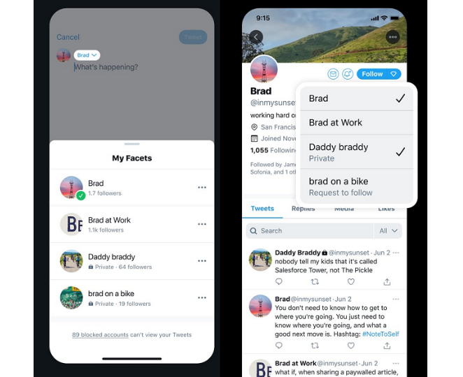Şirket ikinci olarak ise Twitter Facets isimli projesini kullanıma sunmak için hazırlanıyor. Twitter Facets sayesinde, bir kullanıcı farklı kullanıcı adlarıyla tweet atabilecek. Takipçilerinin, hangi kullanıcı hesabını takip etmesini seçmesine izin verecek. Bu sayede kullanıcıların her takipçisi her tweeti görmeyecek.