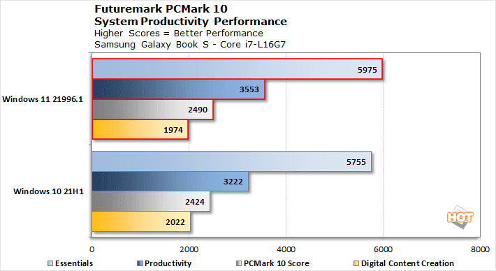 Futuremark PC Mark 10, aynı anda farklı iş yüklerini simüle ettiği için canlı performans testlerine daha yakındır. Windows 11, burada da performans iyileştirmeleri göstermiştir.