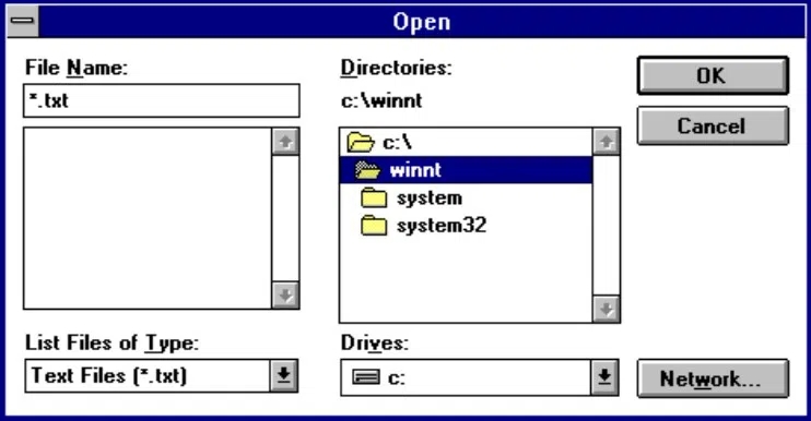 Windows 3.1'den kalma iletişim kutuları görülüyor. Küçük pencereler ve büyük düğmeler, çok düşük çözünürlüklü ekranlar ve karmaşık bir arayüz çizemeyen zayıf donanımdan kaynaklanıyordu.