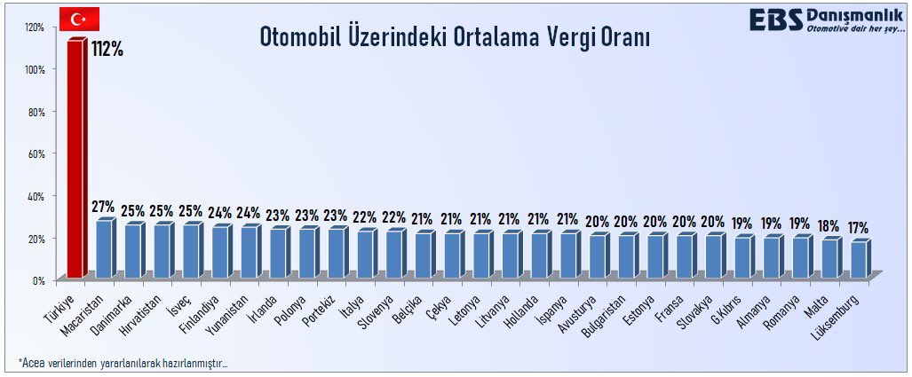 Gazeteci Emre Özpeynirci'nin paylaşımına göre Türkiye'de otomobillerden alınan vergi, Avrupa ülkelerine kıyasla en az 5 en çok 15 kat fazla. Türkiye'de otomobil vergisi %112 civarına ulaşmış durumda ve bu da yükselen döviz kuru ve enflasyonla birlikte araç satın almayı imkansız hale getiriyor.