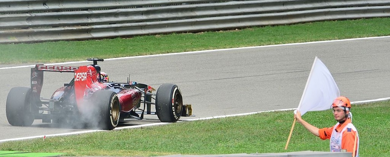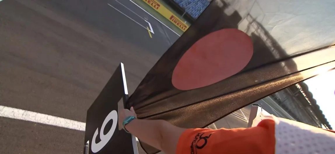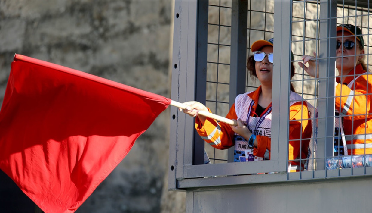 Raundun durduğunu gösterir. Büyük kazalar, pist sorunları veya olumsuz hava koşulları nedeniyle kırmızı bayrağı görebiliriz. Kırmızı bayrak görüldükten sonra araçlar genellikle garajına geri döner.