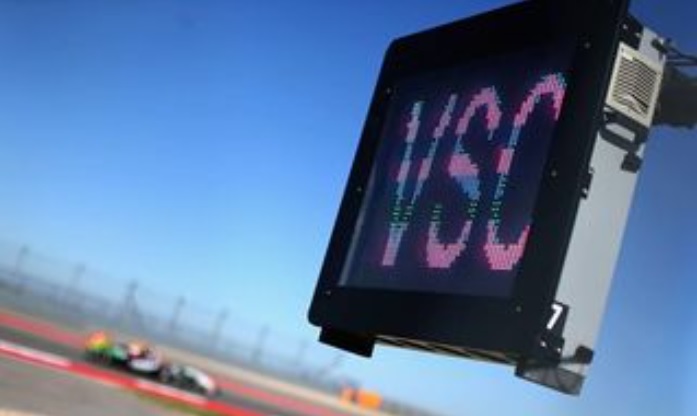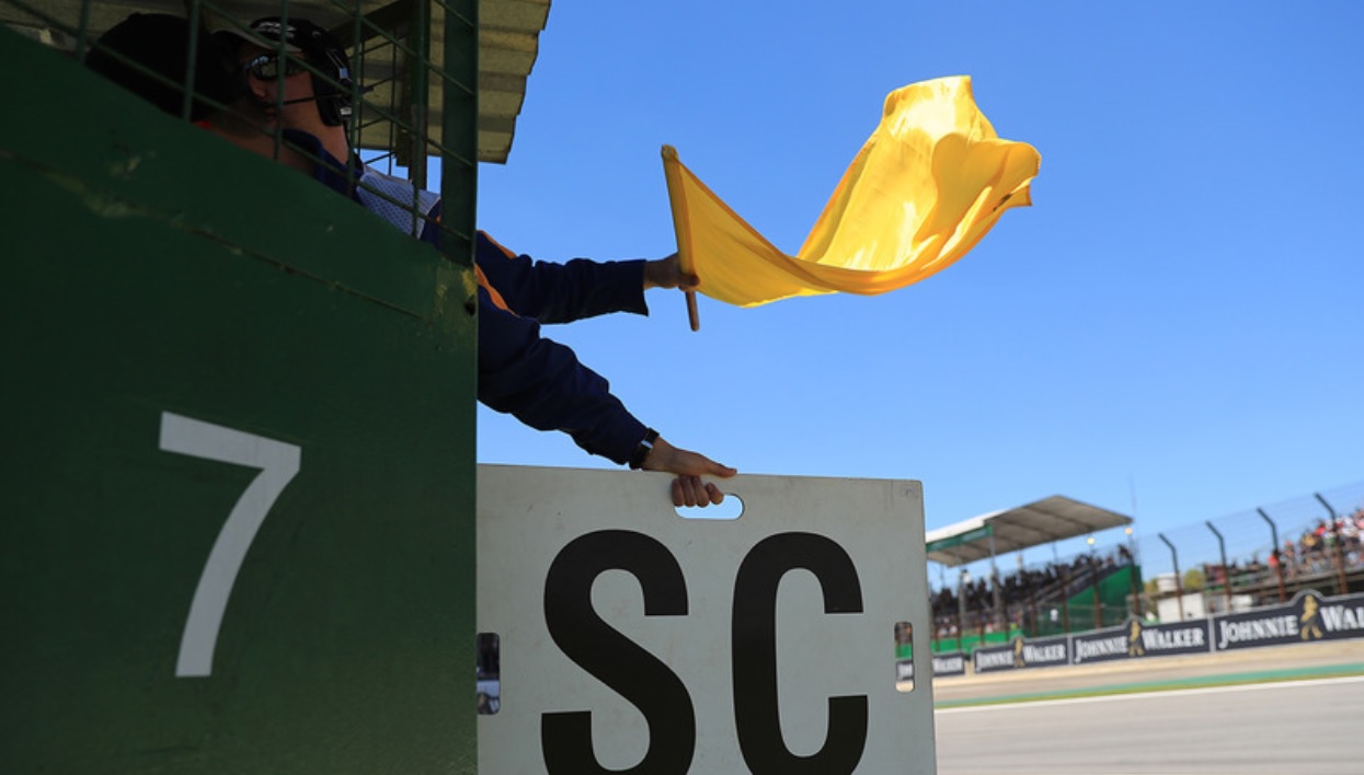 Güvenlik cihazı veya sanal güvenlik cihazı uygulaması etkinleştirildiğinde görüntülenir. Güvenlik aracı önderliğinde seyahat için geçiş izni yoktur. Formula 1 yarışında görebileceğimiz işaretler bunlar. Pilot bayrağa uymazsa çeşitli cezalara tabi olacaktır. Bu cezaların seviyesi uyarıdan, rekabetten ihraç etmeye kadar gider.