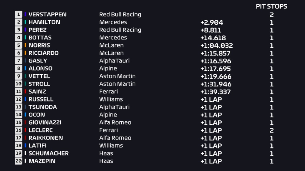 Formula 1'de sezonun 7. yarışı olan Circuit Paul Ricard pistindeki Fransa Grand Prix'sini Max Verstappen kazandı. Yarışa pole pozisyonunda başlayan ama henüz ilk virajda lastik kilitlemesi sonucu Hamilton'a geçilen Redbull'un Hollandalı pilotu Max Verstappen, uyguladıkları pitstop stratejisi sayesinde damalı bayrağı gören ilk isim oldu.Formula 1'de sezonun 7. yarışı Fransa Grand Prix'sini Red Bull'un Hollandalı pilotu Max Verstappen kazandı. Şampiyona liderli Verstappen, bitime 1.5 tur kala Mercedes'in İngiliz pilotu Lewis Hamilton'ı geride bırakarak liderliği aldı ve yarışı kazanmayı başardı.Yarıştaki genel sıralama şu şekilde oluştu: