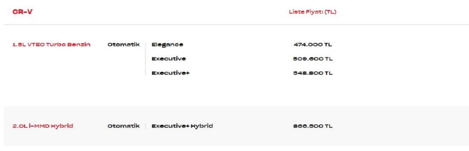 Bu kampanya SUV segmentinden araç arayanlar için de önemli. Kaslı yapısı, güçlü ve verimli motoruyla CR-V, Haziran ayı boyunca sürecek bir kampanya ile yeni sahiplerini bekliyor.19 inçlik jantlarıyla dikkat çeken CR-V, aktif ön ızgara ve açılır panoramik cam tavan gibi birçok özelliği sayesinde kullanıcılarına oldukça konforlu bir yolculuk sunuyor. Öte yandan VTEC teknolojisi sayesinde benzin-hava karışımı ideal seviyede tutuluyor. Böylece CR-V, standart SUV modellerine göre daha az yakıt kullanarak 193 hp ve 243 Nm tork üretiyor.CR-V isteyenler için Honda'nın Haziran ayına özel kredi eylemi; 100 bin kullanımı ile. TL kredi 12 ay %0, 70 faiz oranı ile sunuluyor. Aracın fiyat listesi ise şu şekilde;