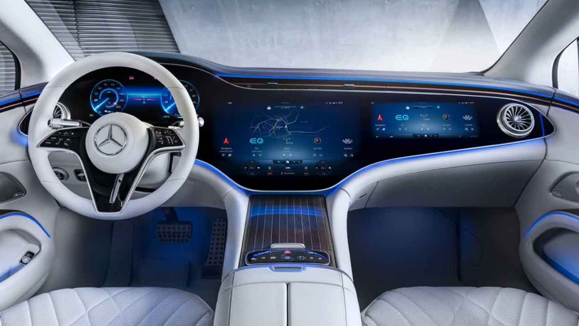 dijital ön konsoluyla fütüristik bir hava sunan EQS'nin ön konsolu tamamen bu araca özel. Ön koltukların arkasına yerleştirilmiş olan ekranlar