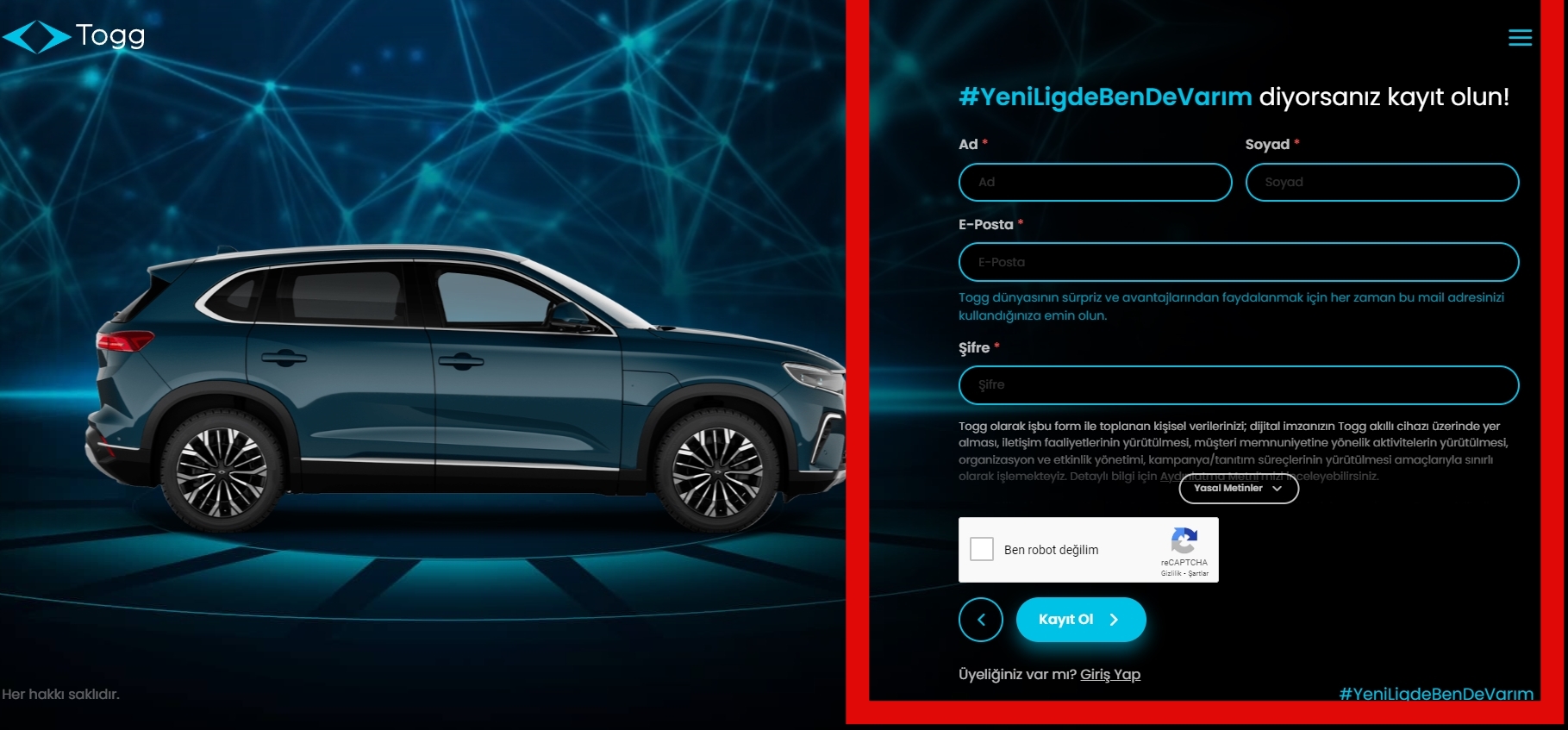 3- Ardından sağ tarafta açılan kısıma bilgilerinizi yazın ve yasal metinleri onaylayıp "Kayıt Ol" butonuna basın