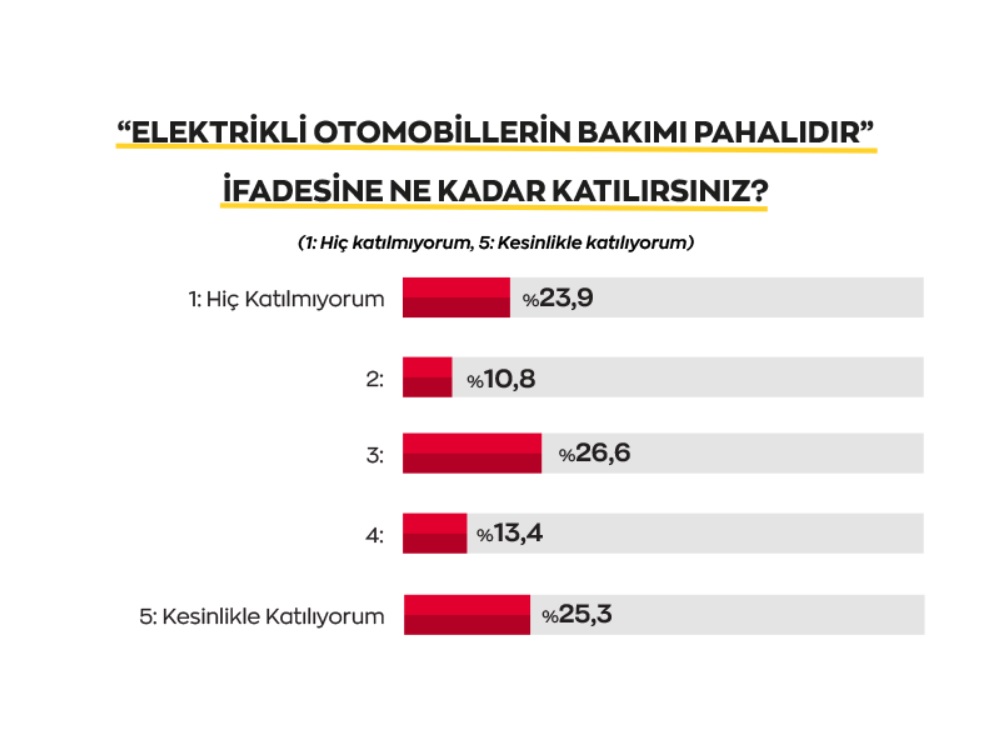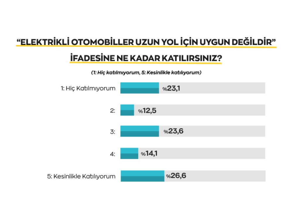 Ankete katılanların %26, 6'sı elektrikli araçların uzun mesafeli yolculuklar için uygun olmadığını söyledi. Bunun temel nedeni şarj istasyonlarının sınırlı sayıda olması, ancak birçok anketör öyle düşünmüyor. Bu durumda katılımcıların %23, 1'ine göre uzun yollarda elektrikli araçlar kullanılabilir. Ayrıca katılımcıların yüzde 25, 3'üne göre elektrik motorlu araçların bakım ve servis masrafları çok yüksek. %23, 9'luk kesimse bu yaklaşımın doğru olmadığını savunuyor.
