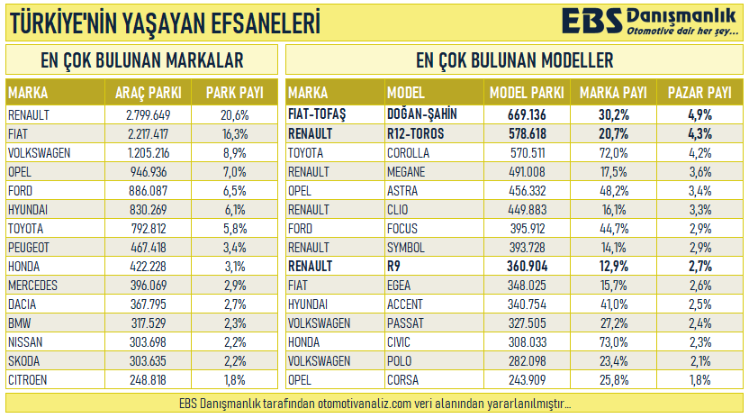 Türkiye'de en çok tercih edilen otomobil markaları ve hangi modellerin yollarda hangi oranda olduğu belli oldu.Otomobil sektörü hakkında önemli veriler açıklayan Erol Şahin, Twitter hesabı üzerinden yaptığı paylaşımda her 100 otomobilin kaçının hangi marka olduğu ve markaların en çok hangi modellerinin yollarda olduğunun bilgisini paylaştı.Paylaşılan istatistiklerde en dikkat çeken kısımlardan biri de ülkemizde en çok bulunan otomobilin Tofaş Şahin, ikincinin ise Renault Toros olması.
