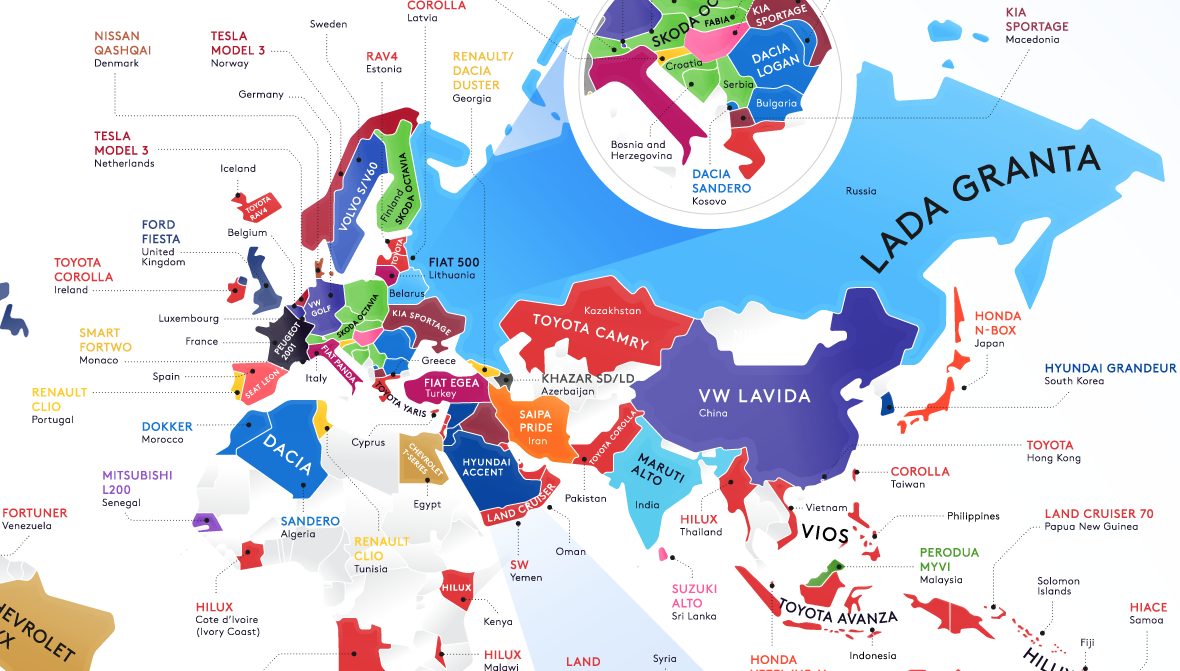 2019 yılında yapılan bir araştırmanın verileri, harita üzerinde görselleştirilerek ülke ülke hangi araba modelinin en çok satıldığı ortaya çıkarıldı.