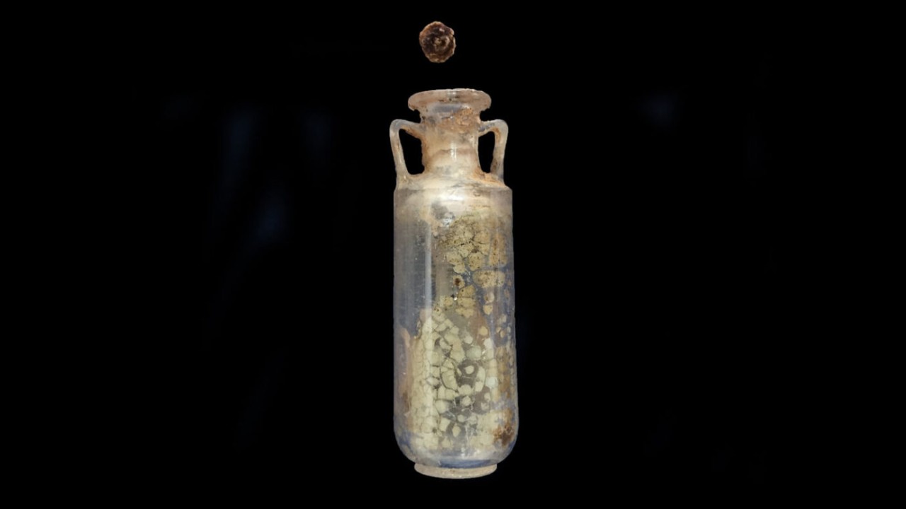 Kuvars şişe, Roma döneminde başlı başına lüks bir nesneydi. Kuvars son derece serttir ve şekil verilmesi zordur. Bu nesnenin küçücük boyutu ve zarif detayları, onu şimdiden bir gömü alanında ender bulunan bir bulgu haline getirdi. Daha da alışılmadık olanı, kimyasal analizin bitüm olduğunu ortaya çıkardığı koyu, katran benzeri bir maddeyle kaplı bir dolomit kapak ile sıkıca kapatılmış olarak bulunmasıdır.