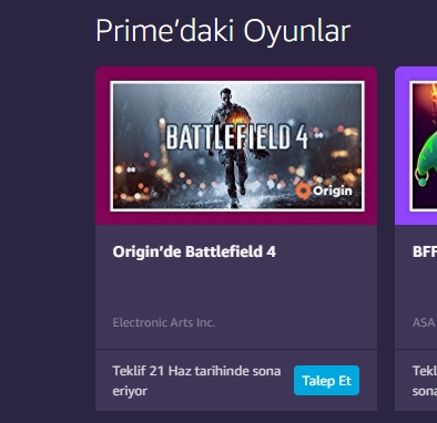 Prime Gaming avantajlarından da faydalanabiliyorsunuz. Bunlar kimi zaman oyun içi kozmetik ürünleri olabiliyor bazen de tam oyunlar.Battlefield 6'nın çıkmasına aylar kala, Amazon'dan Prime üyelerine Battlefield 4'ü ücretsiz dağıtıyor. Eğer siz de Prime üyesiyseniz