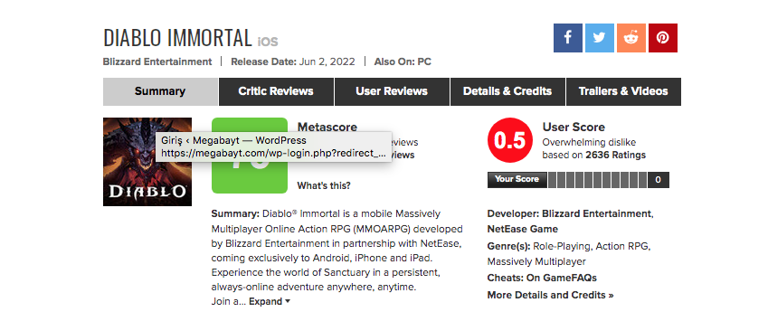 Blizzard’ın PC ve mobil cihazlar için çıkış yapan yeni oyunu Diablo Immortal, Metacritic’te şirketin şu ana kadarki en düşük kullanıcı puanını aldı.