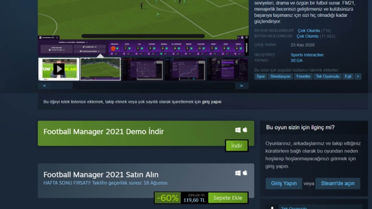 Football Manager 2021 serisinin son oyunu FM 2021, Steam mağazasında