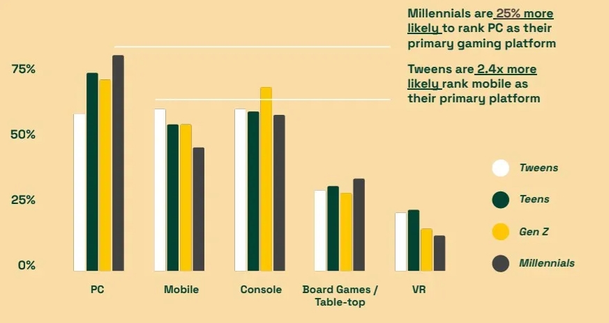 Son 5 yılda her büyük demografi, platform ve oyun türünde insanların oyun etkileşimi arttı. Genele bakıldığında herkesin daha fazla oyun oynadığı görülüyor fakat bazı kuşaklar oyunlara daha fazla ilgi gösteriyor. Ancak düşünüldüğü gibi en çok oyun oynayanlar Z kuşağı değil.
