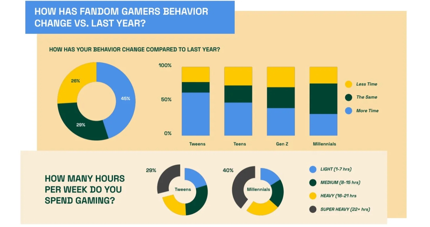 Son 5 yılda her demografik gurpta, oyun oynama oranları artıyor. Oyuncuların yüzde 45'i oyun oynamaya her zamankinden daha fazla zaman ayırıyor. Y kuşağının oyun alanında önemli (ve henüz kullanılmamış) bir kitle olduğu ifade ediliyorken Y kuşağının yüzde 52'sinin oyun oynamayı 1 numaralı ilgi alanı olarak gördüğü aktarılıyor.