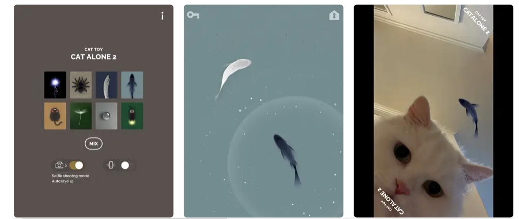 Cat Alone 2 iOS ve Android için kullanılabilen ücretsiz bir uygulama. Cat Alone 2 , kediniz için kırmızı ışık, örümcek, tüy, fare, karahindiba tohumları, su damlası, balık ve ateş böceği dahil olmak üzere sekiz farklı oyun sunar. Ayrıca, vahşi avcınızın hareket halindeyken fotoğrafını çekmenizi sağlayan bir selfie modu sunar.