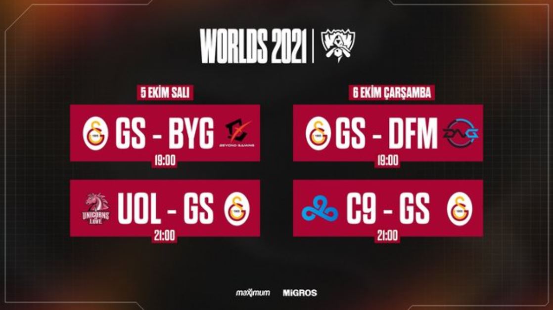Worlds 2021 ön eleme aşamasında mücadele edecek GS Espor (Galatasaray Espor)'un rakipleri: Beyond Gaming, Cloud9, Unicorns of Love, ve DetonatioN FocusMe (DFM) olarak açıklandı.Galatasaray Espor'un ilk gün maçları 5 Ekim'de Beyond Gaming (TSİ 19.00) ve Unicorns of Love'a karşı olacak. (TSİ 21.00)2. gün maçları ise 6 Ekim günü DFM(TSİ 19.00) ve Cloud9'a karşı. (TSİ 21.00)