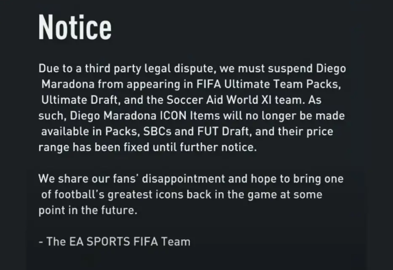 "Üçüncü şahısların yasal anlaşmazlığı nedeniyle Diego Maradona'nın FIFA Ultimate Team Paketlerinde, gelecekteki FUT içeriğinde ve EA SPORTS FIFA 22'deki Soccer Aid World XI'de yer almasını askıya aldık. Bu nedenle, Diego Maradona İKON Ögeleri artık Paketlerde, KKG'lerde ve FUT Taslağı olarak sunulmayacak ve fiyat aralığı bir sonraki duyuruya kadar mevcut değerinde kalacak. Oyuncularımızın hayal kırıklığını anlıyoruz ve gelecekte futbolun en büyük simgelerinden birini oyuna geri getirmeyi umuyoruz."