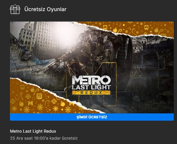 Epic Games, 31 TL değerindeki Metro: Last Light Redux oyununu 25 aralık TSİ 19.00'a kadar ücretsiz olarak veriyor. Eğer oyunu bir kez kütüphanenize eklerseniz tamamen sizin olacak.