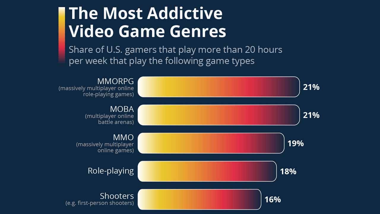 Araştırma sonucuna göre oyun bağımlılığına neden olan en yaygın oyun türü MMORPG oldu. Yani Knight Online, World of Warcraft, Metin2 gibi oyunlar oyun bağımlılığına neden oluyor.Haftada 20 saatten fazla oyun oynayan katılımcıların yüzde 21'i MMORPG oynamaktaydı. Ancak bu oyun türü, tek başına zirvede değil. Oyun tutkunlarının MMORPG türü nedeniyle bağımlı olmaları ile League of Legends (LoL) gibi MOBA türü oyunlar nedeniyle bağımlı olmalarının oranı aynı.Araştırmalara göre en çok bağımlılık yapan üçüncü oyun türü MMO'lar. MMO oyunlarına bağımlı olan oyuncuların oranı ise katılımcıların yüzde 19'u. Listenin şu ana kadarki kısmına baktığımızda oyuncuların online çok oyunculu oyunlar nedeniyle bağımlı hale geldiğini görüyoruz.Statista'nın araştırmasına göre, bağımlı hale gelen oyuncuların yüzde 18'i rol yapma oyunlarına karşı olan tutkularından kaynaklanıyor. Öte yandan, haftada en az 20 saat oyun oynayan anket katılımcılarının yüzde 16'sı nişancı oyunları oynamayı tercih ediyor. Elbette nişancı oyunlarının başında Counter-Strike: Global Offensive gibi yapımlar gelmekte.