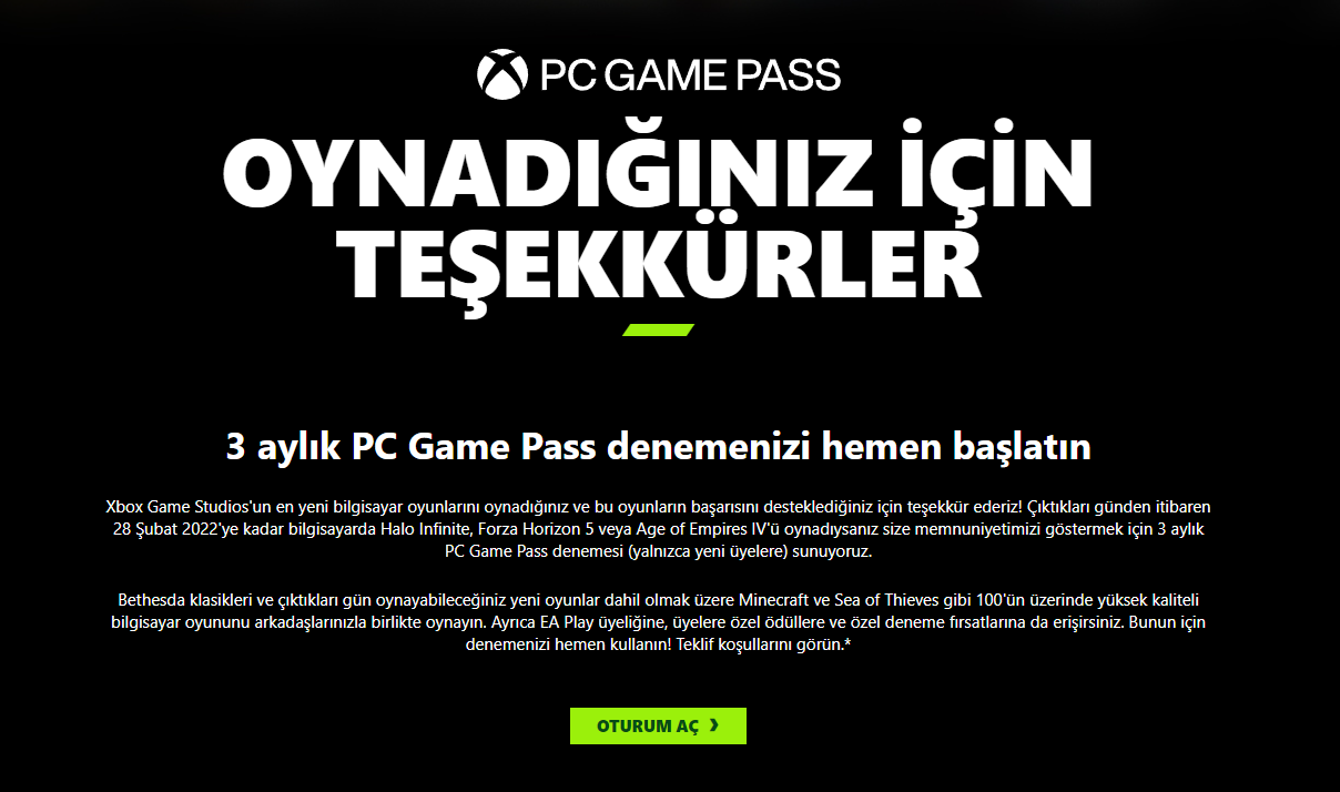 Xbox Game Studios’un en yeni bilgisayar oyunlarını oynadığınız ve bu oyunların başarısını desteklediğiniz için teşekkür ederiz! Çıktıkları günden itibaren 28 Şubat 2022’ye kadar bilgisayarda Halo Infinite, Forza Horizon 5 veya Age of Empires IV’ü oynadıysanız size memnuniyetimizi göstermek için 3 aylık PC Game Pass denemesi (yalnızca yeni üyelere) sunuyoruz.