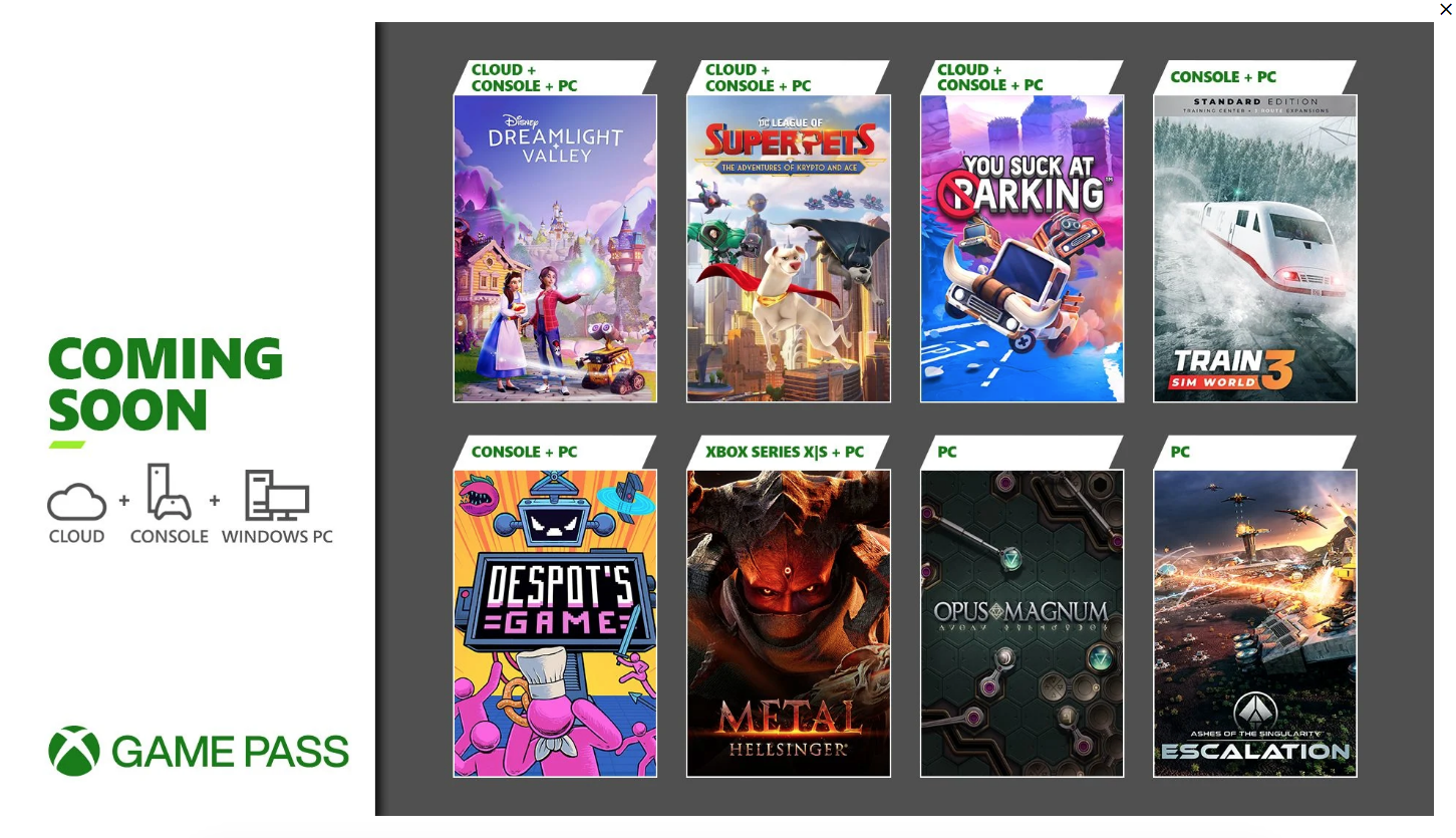 Eylül ayının daha önce duyurulan Xbox Game Pass oyunları arasında Disney Dreamlight Valley , Opus Magnum, Train Sim World 3, Ashes of the Singularity: Escalation, League of Super-Pets: The Adventures of Krypto and Ace, You Suck at Parking, Despot's Game ve Metal:Hellsinger yer alıyor.