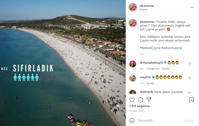 Bugün itibarıyla koronavirüs tedbirleri dahilinde birçok yasağın kaldırılması veya hafifletilmesi gündemde. Kafe ve restoranların da açılması bekleniyor. Yaz aylarının gelmesiyle tatile çıkmak için bekleyen vatandaşlar, yeni açıklanacak normalleşme kurallarını bekliyor. Tam kapanma ve diğer önlemlerin pozitif sonuçları ise yavaş yavaş gün yüzüne çıkmaya başladı.Çeşme Belediye Başkanı Ekrem Oran, dün sosyal medyada paylaştığı bir gönderiyle ‘tatil planı yapsam mı yapmasam mı’ ikileminde kalan vatandaşların içine su serpti. Oran, Instagram’dan paylaştığı gönderide Çeşme’de yeni COVID-19 vakalarının görülmediğini duyurdu.Turistleri ilçeye çağıran belediye başkanı, paylaştığı gönderide şu sözleri kullandı: "'Yasaklar kalktı, nereye gitsek’ diye düşünmeyin. Sağlıklı tatil için Çeşme'ye gelin. İzmir Valiliği'nin açıkladığı verilere göre Çeşme'mizde yeni vakaya rastlanmadı.” Ekrem Oran, verdiği müjdeli haberi ‘#NefesAlÇeşme’ ve ‘#adresimçeşme’ etiketleriyle noktaladı. Çeşme planı olan Instagram kullanıcılarından ise gönderiye olumlu ilgi yağdı.